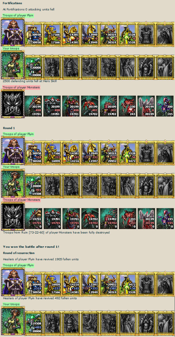 At 2107 the two allied armies guided by their heroes started the battle and the calvary rushed towards the monsters, while the archers took down the flying monsters and the rest of the troops followed with the attack. The monsters tried to resist the attack but they were no match for the force of the allied armies and they were completely annihilated in just one round. There were some losses from the allied armies but thanks to the help of the healers they were brought back to life and they all went back home victorious and with a great treasure.