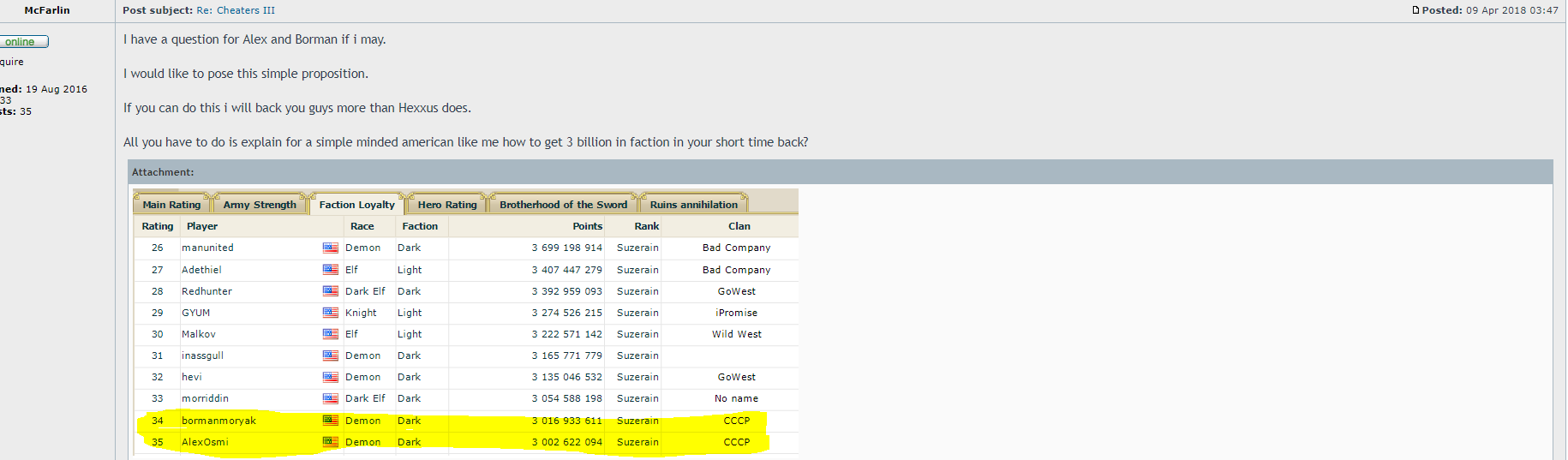borman and alex had same faction points, they take same army from inasgull or someone else (that 50 players they mention). show us your battles. alex show your battles where you get 11M of hero experience.