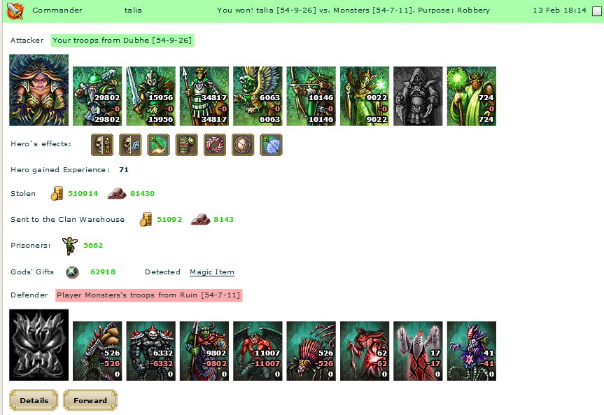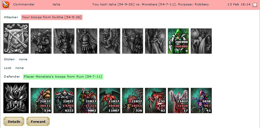 Spies should give signs to begin the battle. We were waiting but suddenly we heard frightful monster scream. That scream trigger an alarm in enemy camp. We lost our surprise. We hadn’t time to lose so it was high time to begin the battle. Assassins attacked but monsters were prepared to fight back. Archers joined the battle very quickly. They attacked all monsters on the wall. After that centaur battalion attacked the main entry and Griffins dashed the last enemies on the wall. When the main entry was smashed knights enter the fortress. I lost a lot of my soldiers, because assassins’ attack wasn’t so successful as I expected. Butoponent was in lostsituation.